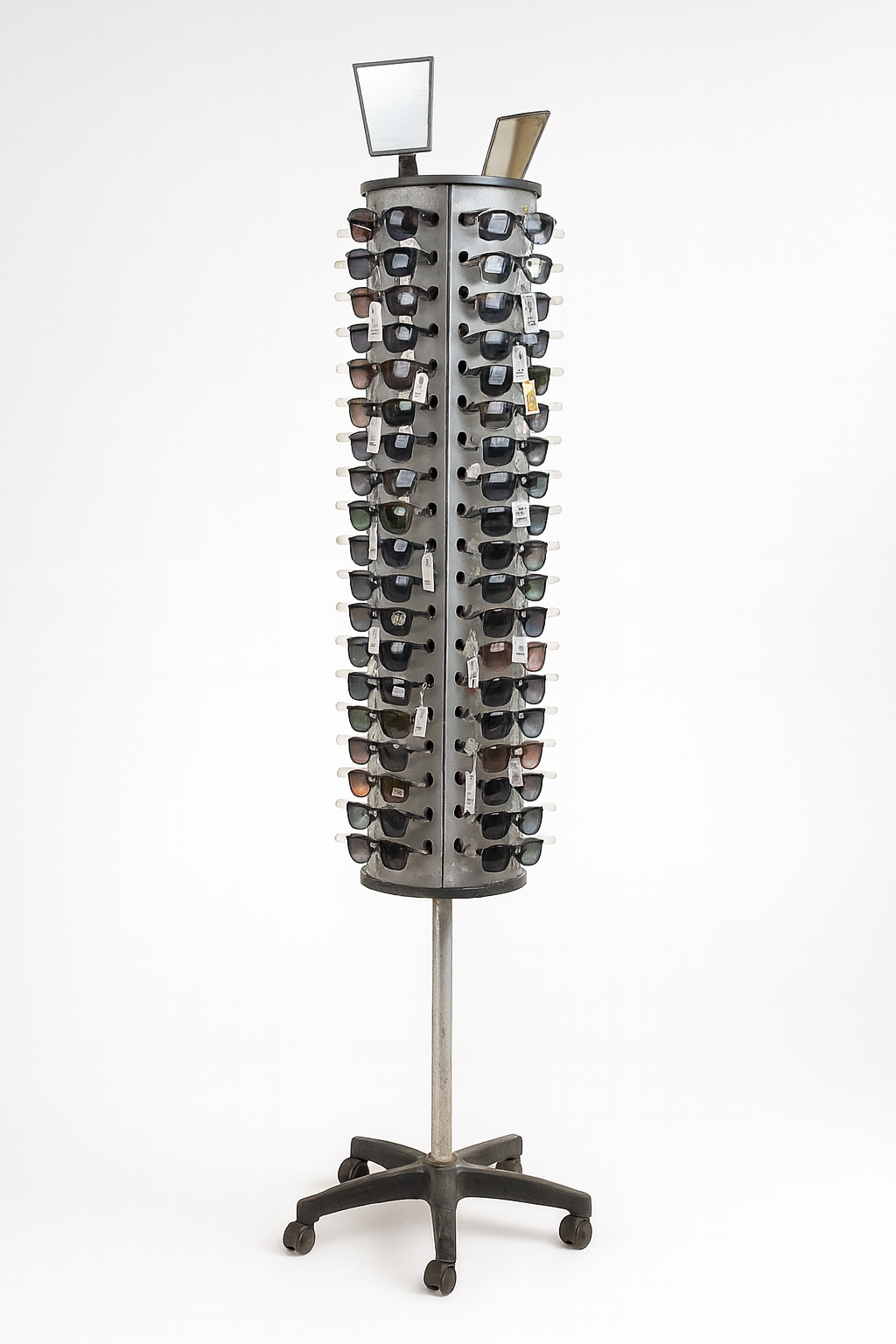Technik: Drehbarer Zylinderturm mit perforierten Metallpaneelen, Acryl-Pegs und zwei Kopfspiegeln; stabile Basis