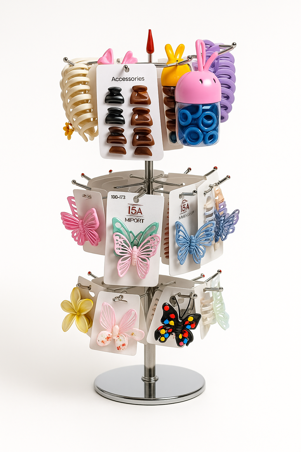 Technik: Tisch-Drehständer aus Metall (verchromt), 360°-Etagenkränze mit Haken, rutschfeste Standplatte, Preisreiter/Labels möglich