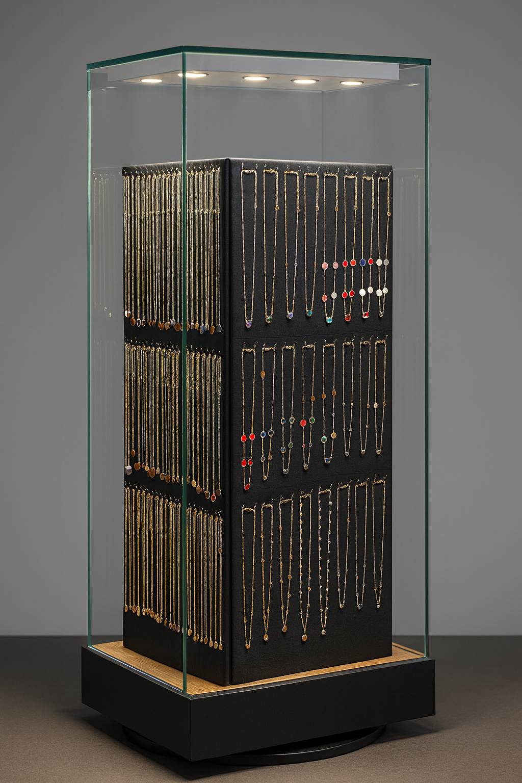 Technik: Drehbarer Vierseiten-Tower mit Samt-Boards in Glasvitrine (LED-Downlights, verdeckter Drehteller, Holzdekor-Sockel; optional abschließbar)